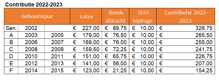 Daarnaast wordt er per jaar ook een bijdrage aan het kledingfonds (voor de shirtbijdrage) in rekening gebracht.